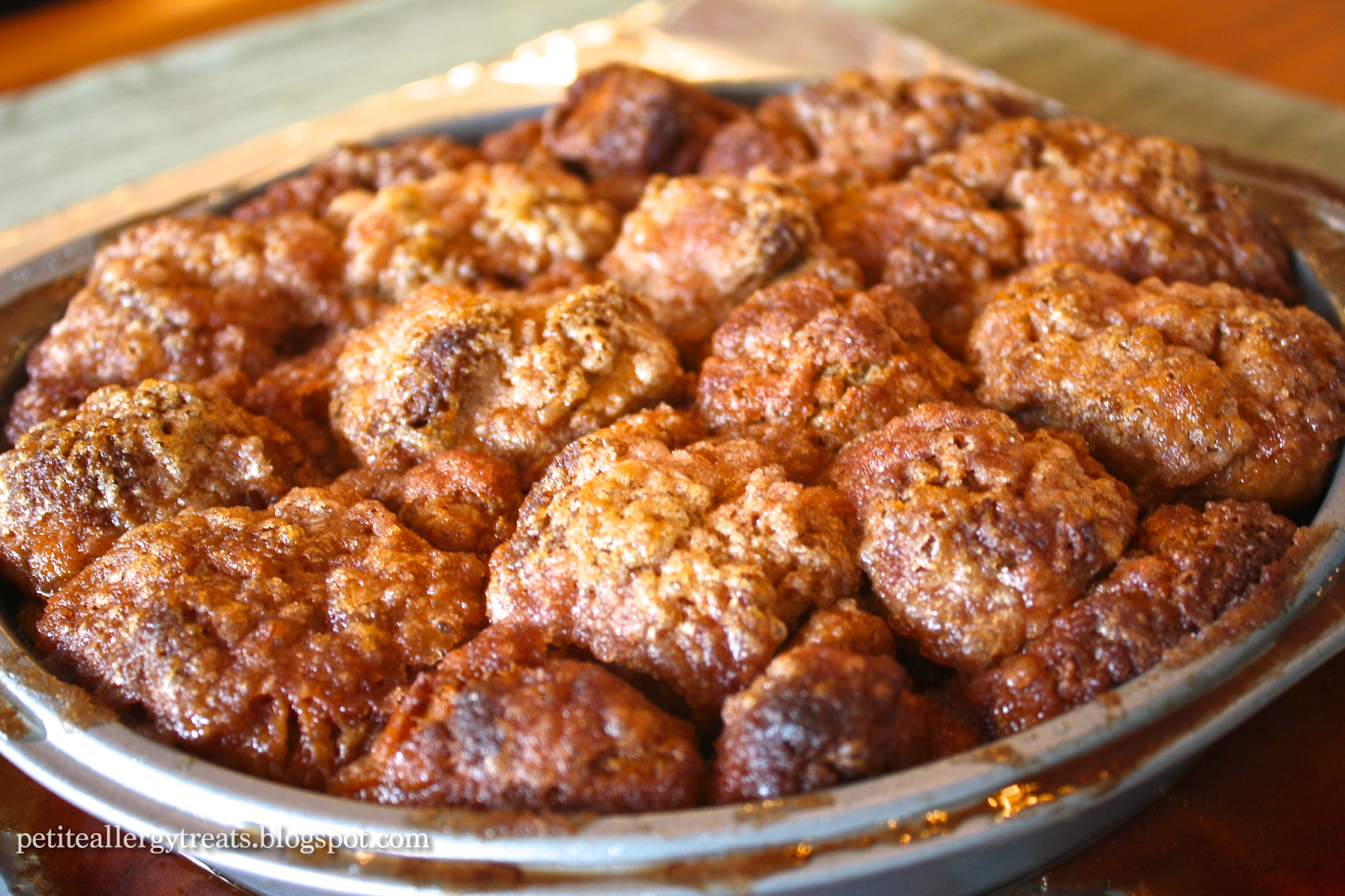 4. For the topping: In a separate bowl melt shortening. In another separate bowl, combine sugar and cinnamon. Grease an 8 or 9 inch round pan with extra shortening. Lightly sprinkle pan with 1 T of cinnamon sugar mix for the topping.