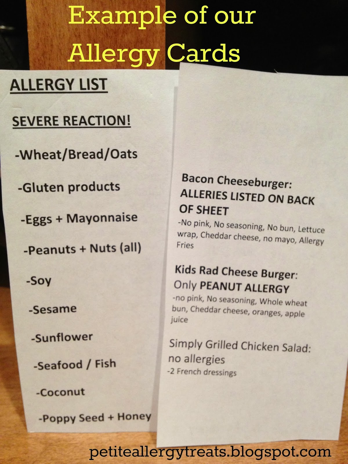 We go to Red Robin more than I’d liked to admit. Part of the reason is, I feel safe there. Their customer service has always been outstanding. The servers and hostess are very kid friendly and most importantly, they understand food allergies. There’s always a list of allergy alerts they type into the computer with our order. The waitstaff is careful to clarify any questions concerning our order, even if it means coming back to our table. We go there so often, I’ve printed our order on the back of our own allergy alert cards.